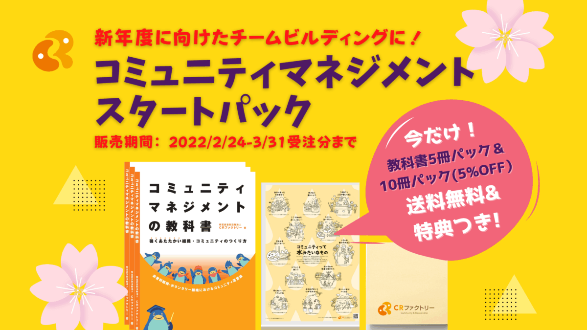 発売以来、「自団体全員でこの本の内容を共有したいです!」「団体のメンバー間で読書会を開いて勉強しています!」等の声を数多くいただいています。新年度を控えたチームビルディング・コミュニティマネジメントのためにCRファクトリーが寄与できることは何か?と考え、コミュニティメンバーとより理解が深められる【5冊パック】【10冊パック】というパッケージを、出版後初めてご用意しました。