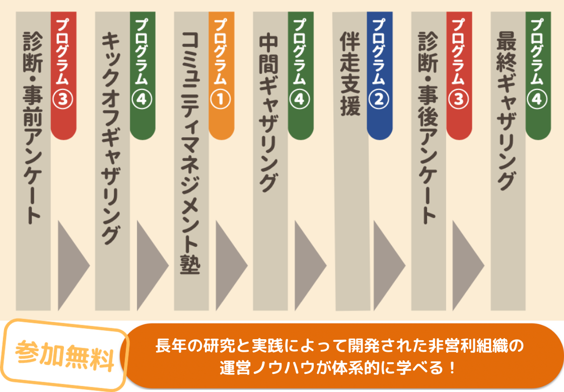 ※本プログラムは神奈川県内の団体が対象となり、すべてのプログラムを参加費無料で受講いただけます。なおプログラム参加にあたっては、説明会の参加が必須となります。