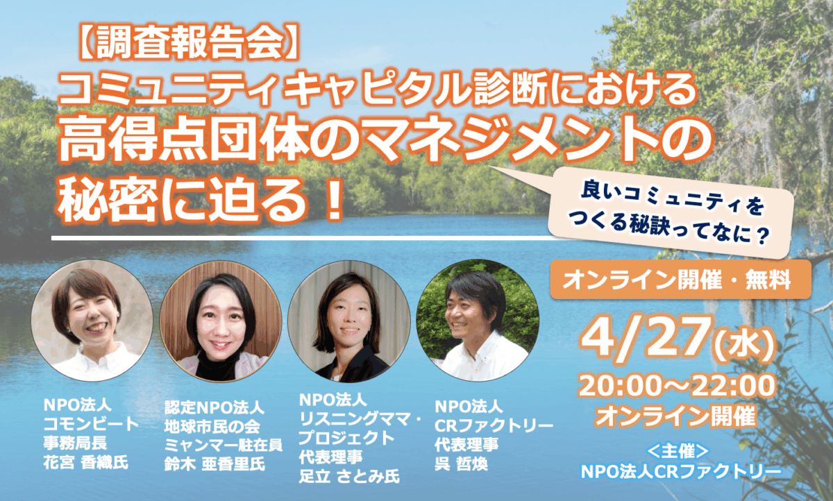 CRファクトリーでは、2016年より「コミュニティキャピタル診断」というコミュニティの状態を測定するツールをリリースし、これまで500団体1万人の方にご利用いただいてきました。
