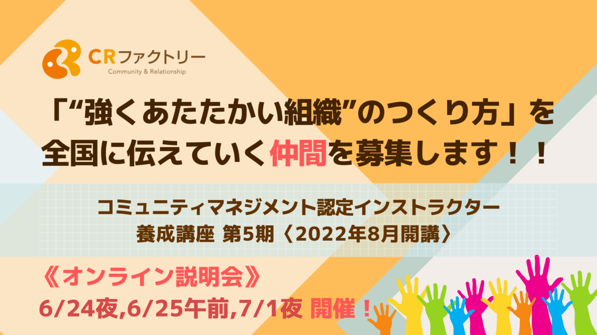 CRファクトリーコミュニティマネジメント認定インストラクター養成講座第5期を以下の通り開講します。