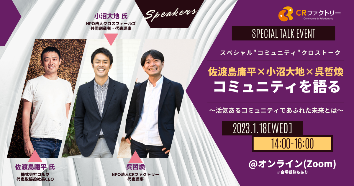 今回はコミュニティに熱く深い想いを持つ株式会社コルクの佐渡島庸平氏と、NPO法人クロスフィールズの小沼大地氏をゲストにお招きし、コミュニティ論を熱く語り尽くします。モデレーターはNPO法人CRファクトリー代表理事の呉哲煥が務めます。