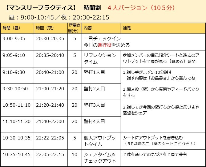*時間帯は3~4人のメンバーで調整します。(上記の時間帯は必須ではありません)