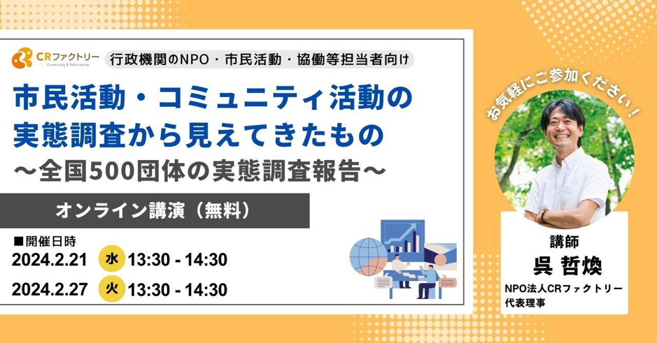 このたびCRファクトリーでは「市民活動・コミュニティ活動の実態調査」を実施しました。調査協力団体のお力添えもあり、全国各地のNPO・市民活動・地域活動・サークル活動の運営者から約500団体の回答をいただくことができました。