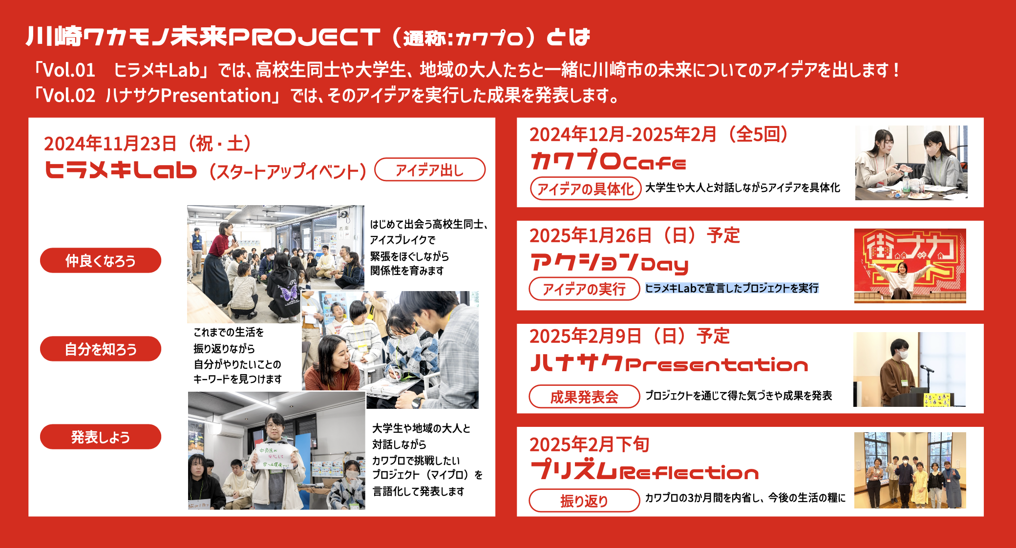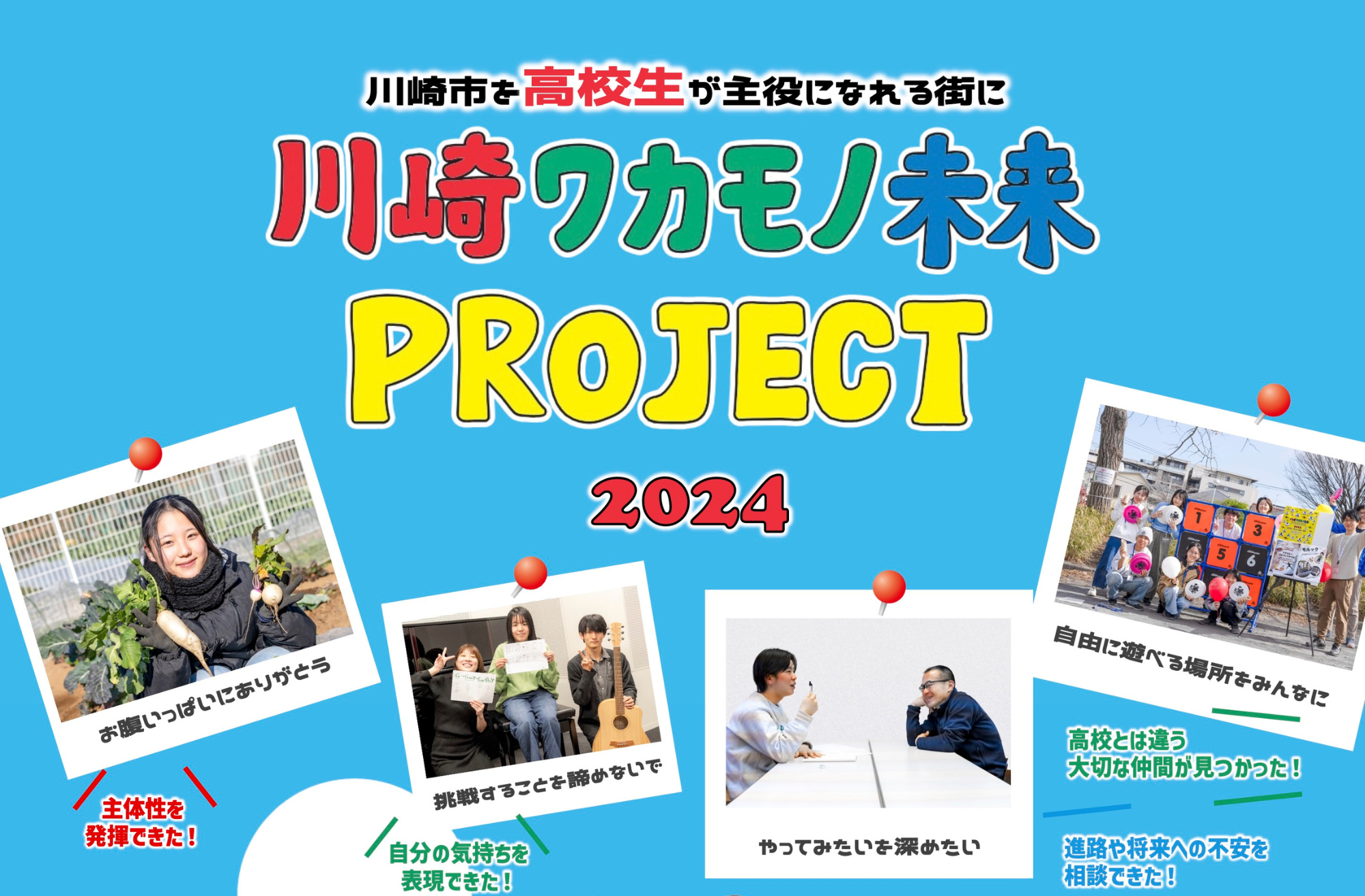 「川崎ワカモノ未来PROJECT」とは、川崎市をフィールドに、自分の身の回りや地域、社会の未来づくりにチャレンジしたい高校生を対象としたプロジェクトです。