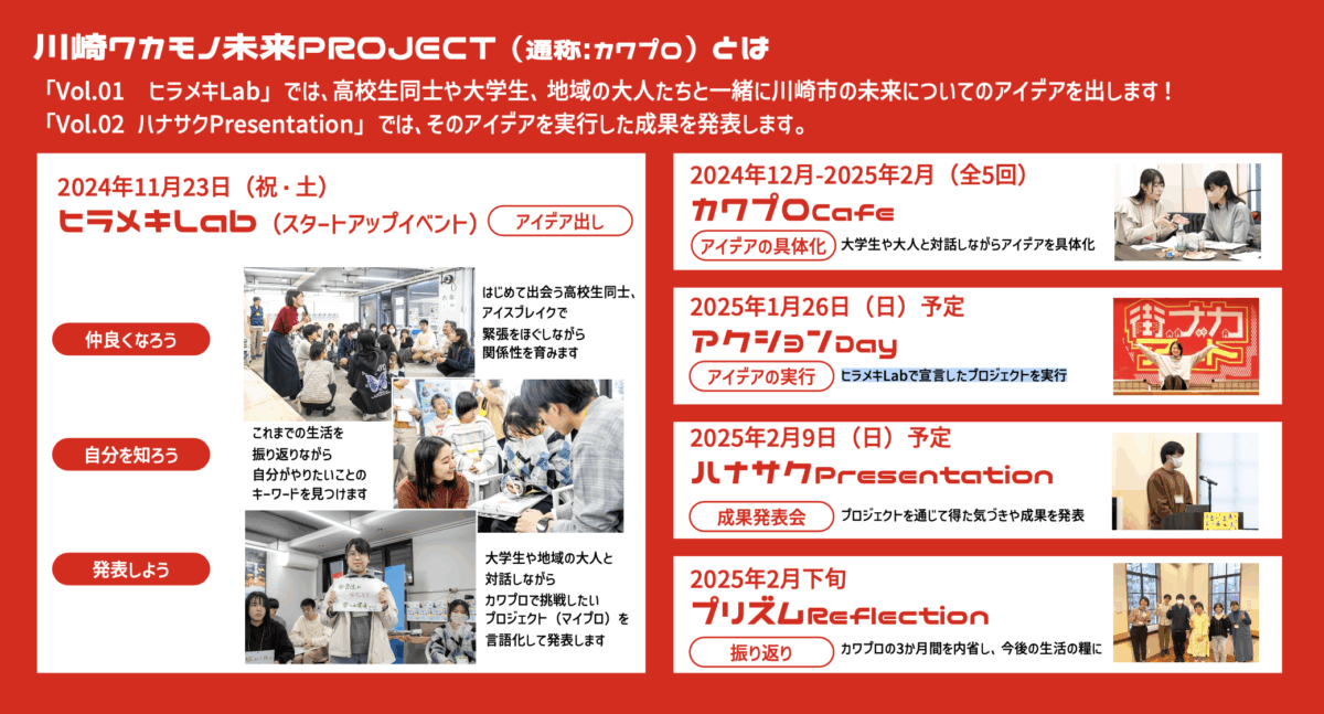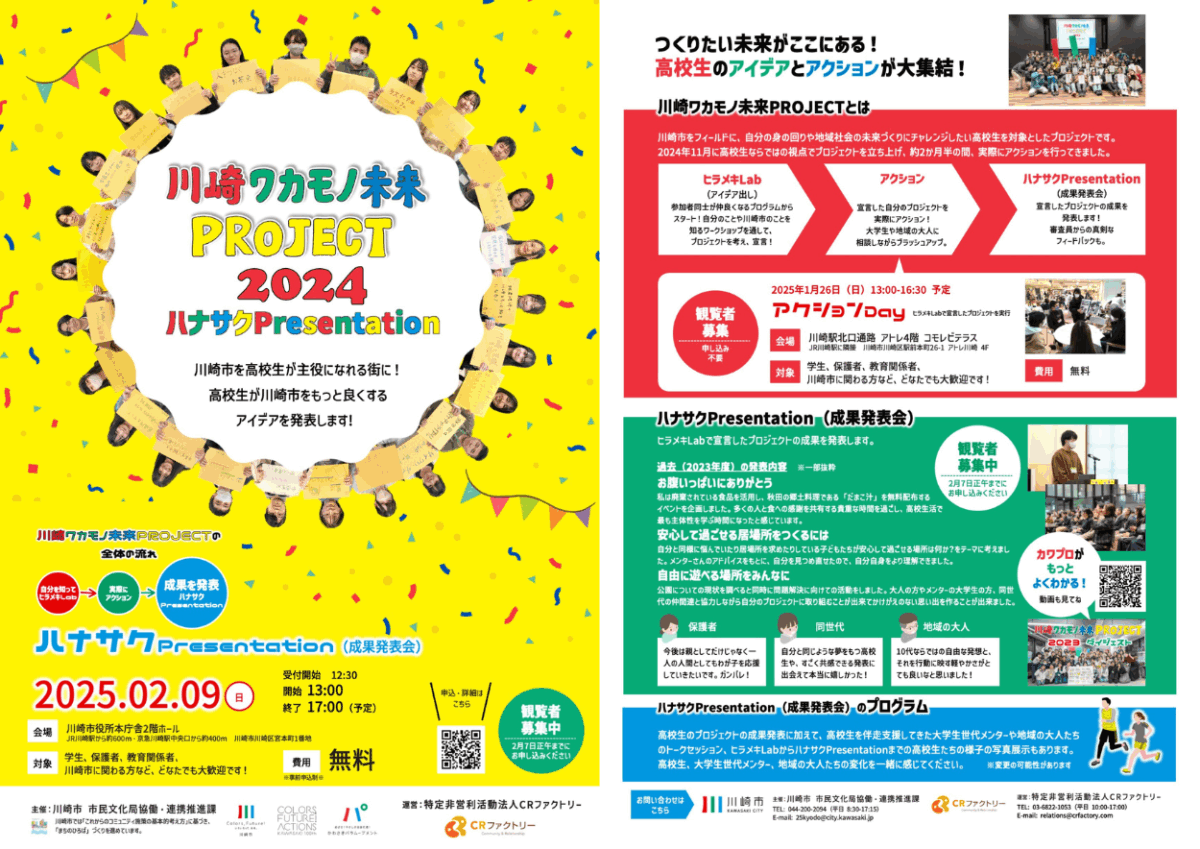 川崎市をフィールドに、自分の身の回りや地域社会の未来づくりにチャレンジしたい高校生を対象とした「川崎ワカモノ未来PROJECT」。2024年11月に高校生ならではの視点でプロジェクトを立ち上げ、約2か月半の間、実際にアクションを行ってきました。