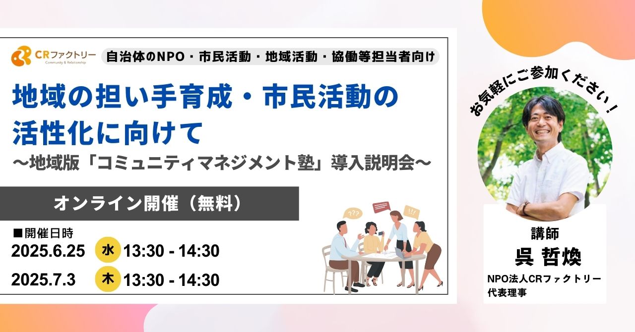 地域版「コミュニティマネジメント塾」は、そうした地域の課題に応えるためにNPO法人CRファクトリーが開発・実施してきた連続講座型プログラムです。市民活動団体・地域団体のリーダーやスタッフ、地域づくりに関わる多様な人々が、「仲間づくり」「コミュニティづくり」「参加のデザイン」などの“コミュニティマネジメント”の視点を学び、自団体の実践に活かしていける内容となっています。