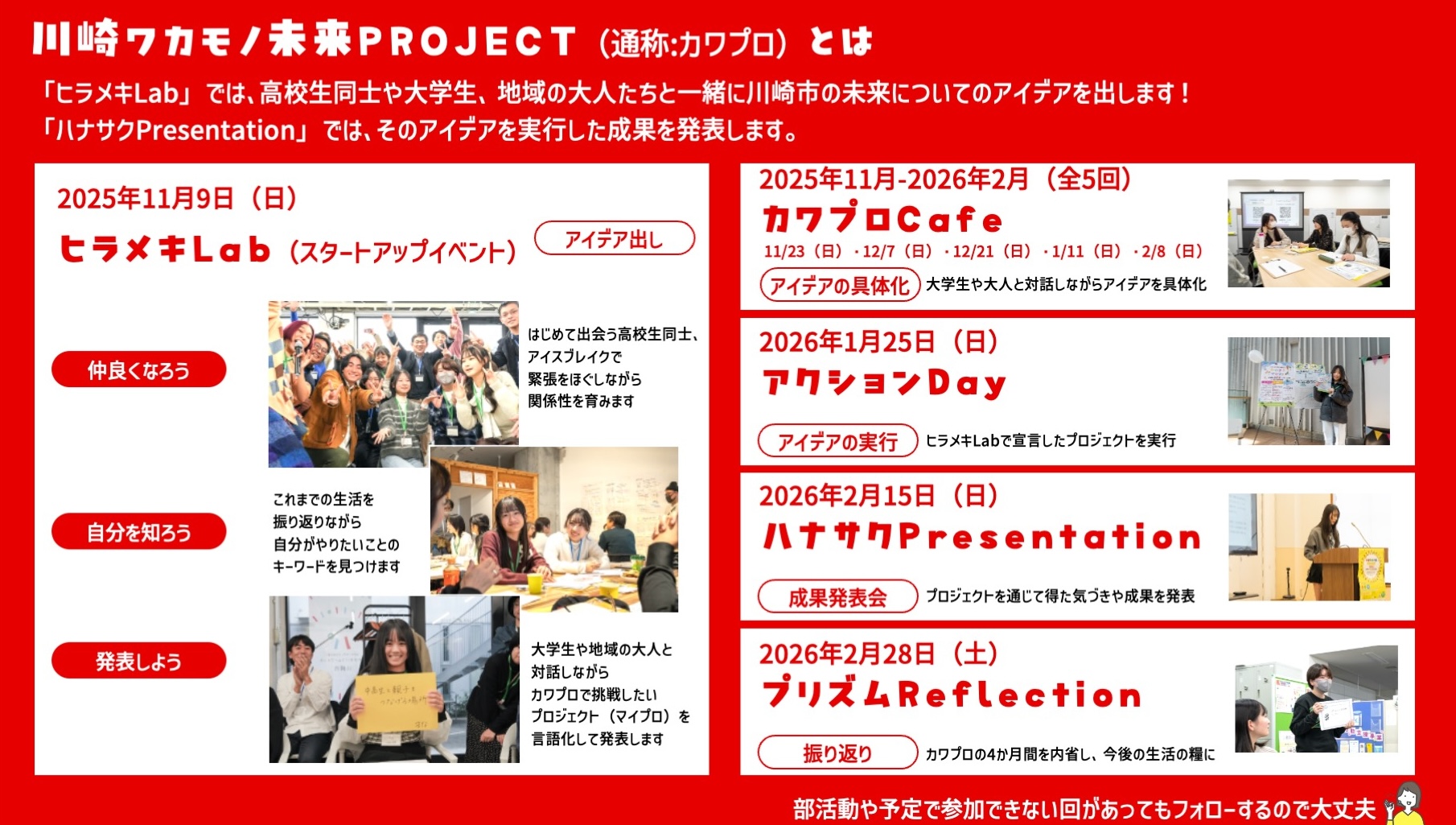 「川崎ワカモノ未来PROJECT」(通称:カワプロ)とは、川崎市をフィールドに、自分の身の回りや地域、社会の未来づくりにチャレンジしたい高校生を対象としたプロジェクトです。