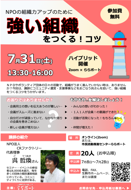 7月31日(土)に奈良県生駒市の市民活動推進センター「ららポート」様の依頼を受けて、「NPOの組織力アップのために強い組織をつくる!コツ」を開催いたしました。