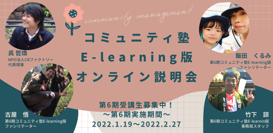 2021年1月から始まる、第6期「コミュニティ塾(E-learning版)」ですが、ご興味のある方向けにオンライン説明会を実施します!