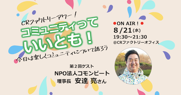 第2回「コミュニティっていいとも!」〜今日は楽しくコミュニティを語ろう!〜ゲスト:NPO法人コモンビート理事長 安達 亮さん