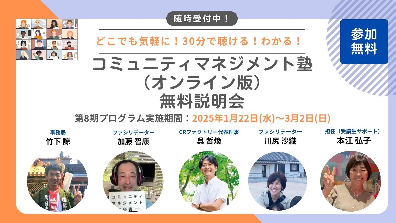 【オンライン説明会】第8期「コミュニティマネジメント塾(オンライン版)」〜動画学習とスクーリングで、学びをホンキで実践につなげる!〜