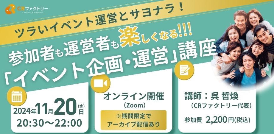 【11/20開催オンライン講座】ツラいイベント運営とサヨナラ! 参加者も運営者も楽しくなる「イベント企画・運営」講座